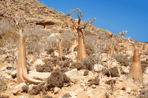Lanskap Socotra didominasi oleh tanaman-tanaman dengan bentuk yang aneh dan mencolok, seolah-olah diambil dari ilustrasi buku cerita fiksi ilmiah.